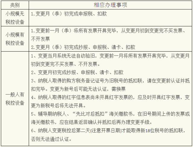 到辦稅服務(wù)廳變更稅務(wù)登記號碼,重新發(fā)行稅控設(shè)備。 稅務(wù)登記變更表(云盤下載) http://pan.baidu.com/s/1jIolBsa 納稅人后續(xù)辦理事項: 變更一證通(可以采取網(wǎng)上變更或到現(xiàn)場變更兩種方式,建議納稅人使用網(wǎng)上變更),重新簽訂稅庫銀三方協(xié)議,重新刻發(fā)票專用章,開通網(wǎng)上認證的納稅人還要在重新注冊網(wǎng)上認證信息。 請注意: 一證通用戶請先登陸網(wǎng)上辦稅服務(wù)廳撤銷三方協(xié)議后,再到辦稅服務(wù)廳辦理變更稅務(wù)登記號,然后再變更一證通后,登陸網(wǎng)廳,并確認是18位登記號,重新簽訂實時繳稅協(xié)議。 3、銀行信息變更,重新簽署“稅銀聯(lián)網(wǎng)三方協(xié)議”(銀行系統(tǒng)) 開設(shè)銀行賬戶時按規(guī)定要登記稅務(wù)登記證號,號碼升位后,應(yīng)終止舊的“稅庫銀三方協(xié)議”,再按照新的18位號重新簽署新的“稅庫銀三方協(xié)議”,為方便納稅人,用原15位號登錄網(wǎng)廳可直接撤銷協(xié)議。登記號變更后,一證通也變更后則可以直接在網(wǎng)廳簽署電子三方協(xié)議。 有些企業(yè)變更登記號后原三方協(xié)議仍然生效,是因為企業(yè)在銀行內(nèi)留的稅務(wù)登記號未變更,但當(dāng)銀行內(nèi)的稅務(wù)登記號變更,則必須重新簽署三方協(xié)議。企業(yè)變更登記號后則不能在網(wǎng)廳直接撤銷三方,需要到辦稅服務(wù)廳撤銷三方協(xié)議才能辦理。 重新簽訂三方協(xié)議(原三方協(xié)議能正常使用的,不需要重新簽署)。 4、重新刻制“發(fā)票專用章”(公安部門) 發(fā)票專用章中要求刻入稅務(wù)登記證號,號碼升位后,納稅人要及時申請刻制印章。另外,有些單位其他印章也可能涉及稅號變化,如合同專用章,請務(wù)必及時更換。 5、涉及號碼變更的其他事項(統(tǒng)計局、網(wǎng)站備案……) 納稅人還要到其他涉及稅號營業(yè)執(zhí)照編號的部門逐一辦理稅號、營業(yè)執(zhí)照的變更,請勿遺漏。 -------------------------------------------------- 免責(zé)聲明 本站有些內(nèi)容來自網(wǎng)絡(luò),我們對文中觀點保持中立,對所包含內(nèi)容的準(zhǔn)確性、可靠性或者完整性不提供任何明示或暗示的保證,請僅作參考。如有侵權(quán),請聯(lián)系刪除。 |